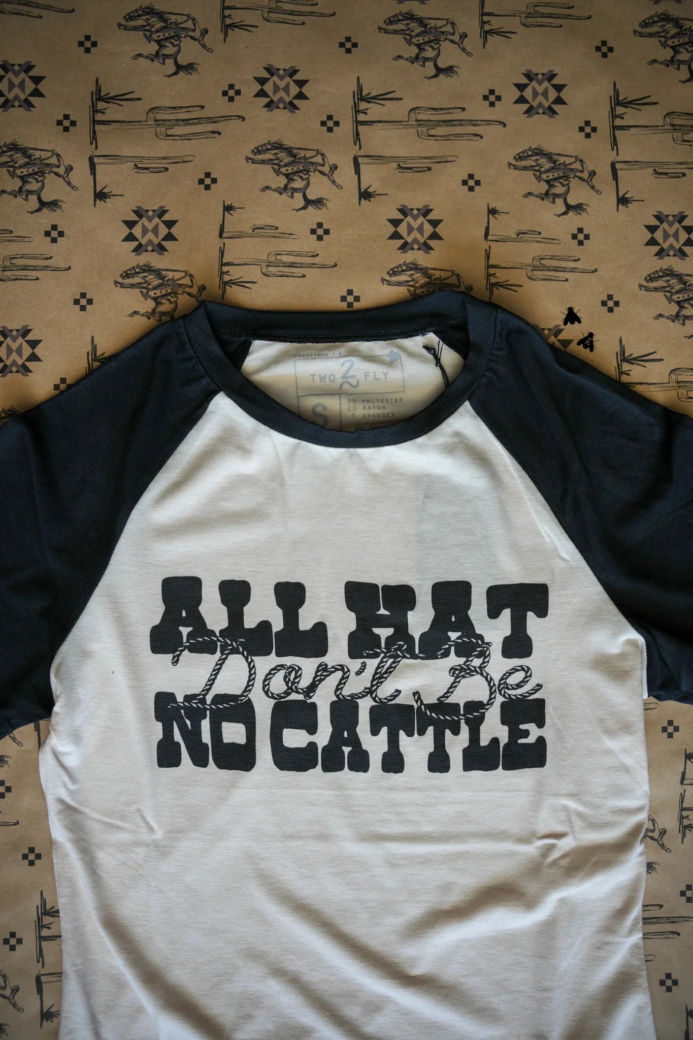 Don't just talk the talk, walk the walk in our All Hat No Cattle Tee. This black raglan-style tee is not only comfortable (hello 75% polyester, 20% cotton, and 5% spandex!), but also a true-to-size fit. Don't be all hat and no cattle, get your hands on this tee today!
