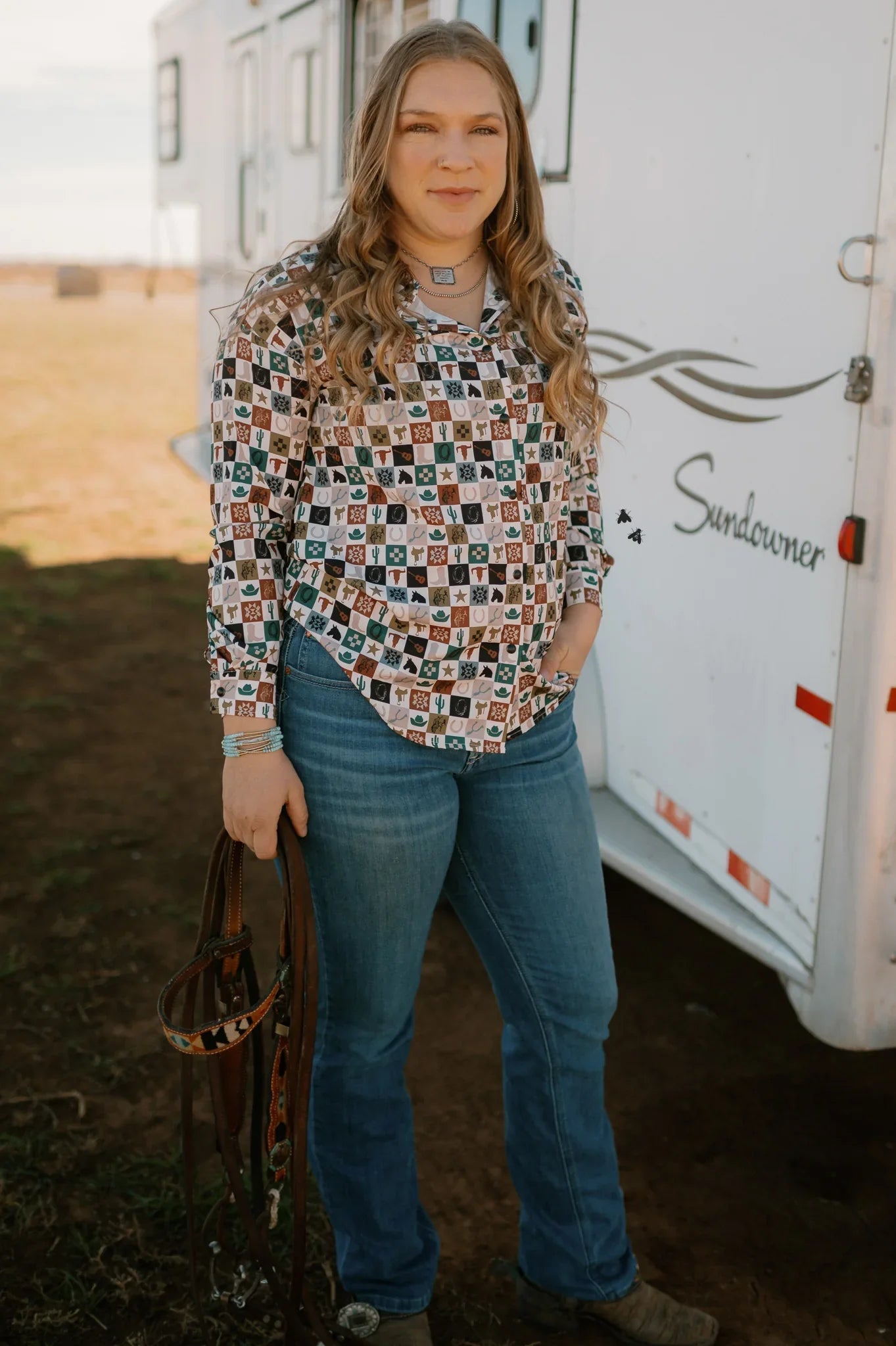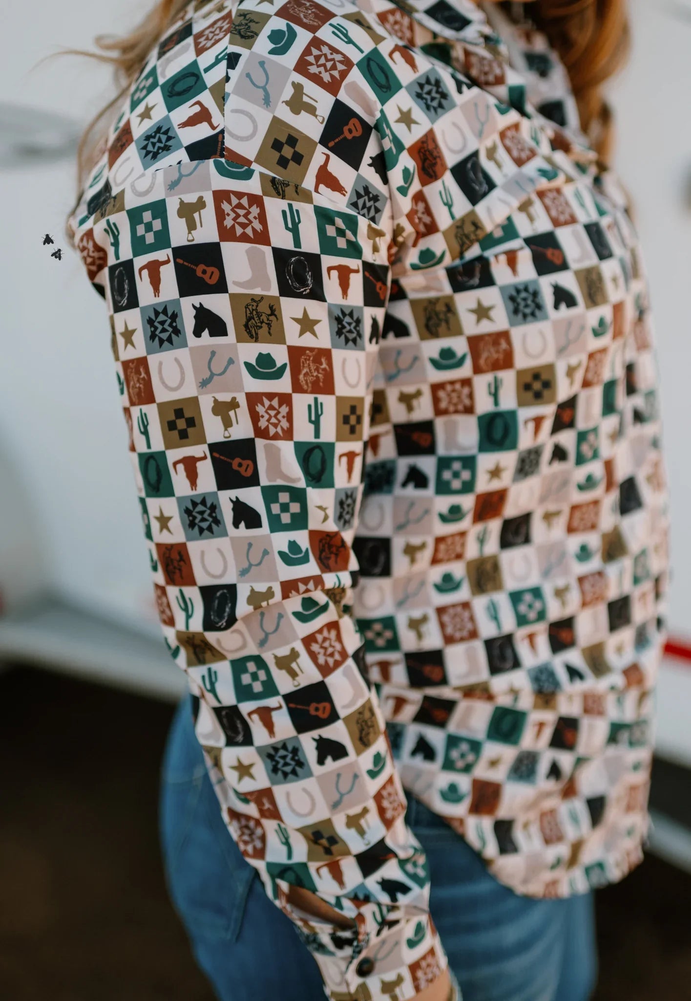 Snap into style with our Block Bucks Top! This button down features unique black pearl snaps and a western check pattern. Made with 95% polyester and 5% spandex, it's not only fashionable but also comfortable and true to size. Your wardrobe will thank you!