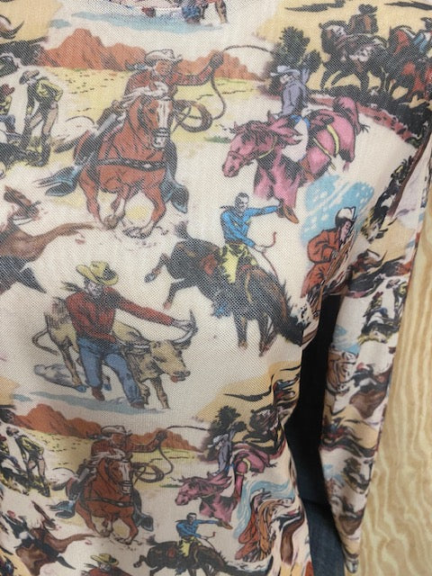"Add some playful western vibes to your wardrobe with our Vintage Western Semi Sheer Mesh Top! This colorful and stretchy top can be worn under our overalls or styled with a tee shirt over the top for a fun and versatile look. Get ready to turn heads with this unique piece!"