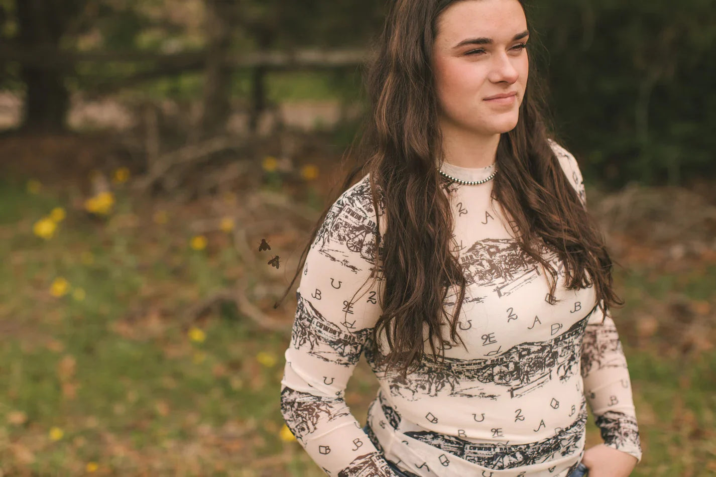 Get ready to steal the spotlight at any corner with our High Noon Long Sleeve Top. Featuring a playful tombstone town pattern and a stretchy mesh tee, this top is perfect for any casual or dressy occasion. Plus, the matching tank liner provides added comfort and style. You won't want to leave home without it. Yeehaw!