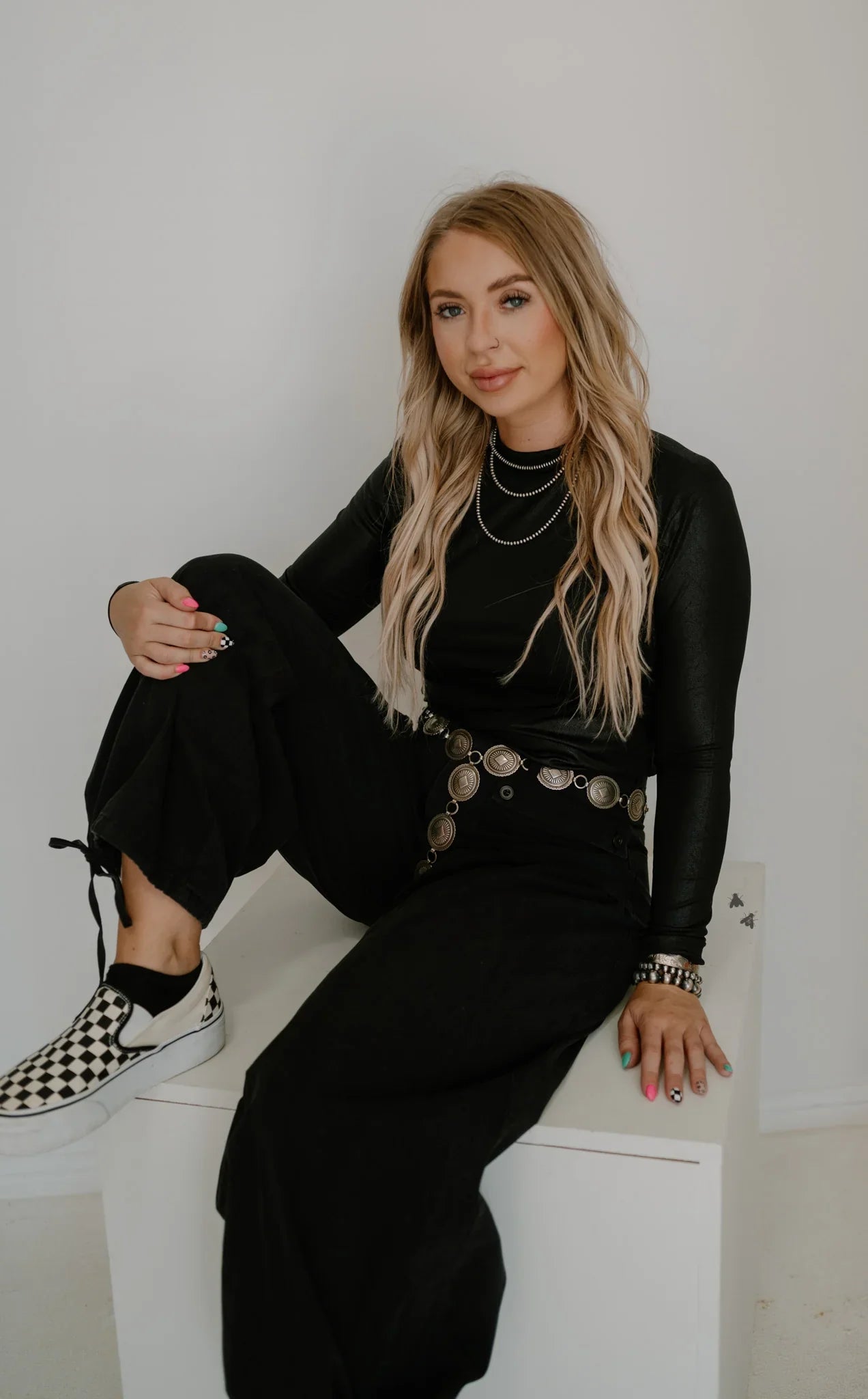 Step up your cowgirl game with our Leddy Leather Long Sleeve! Made with luxurious leather material, this top will add swanky flair to any outfit. The midnight leather fabric gives a touch of edge, while the mock neck long sleeve style keeps you warm and classy. True to size for a perfect fit. Yee-haw!