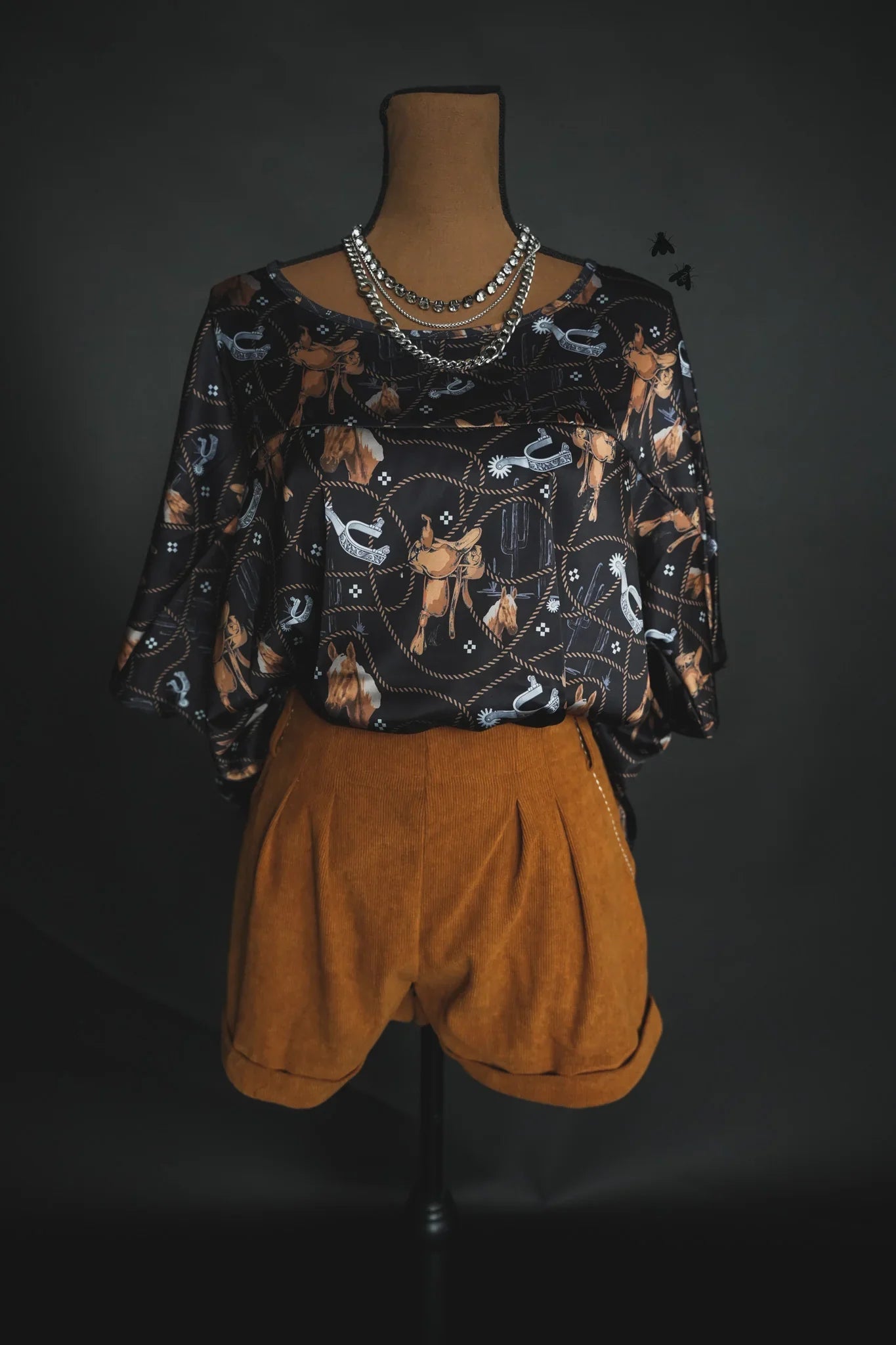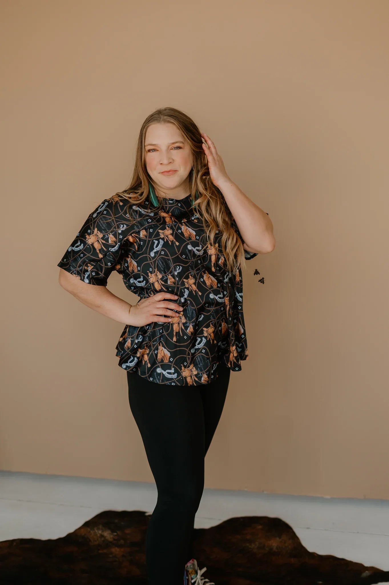 Step into the wild, wild west with our Palomino Print Top! This vintage-inspired satin top boasts a bold western print and an oversized poncho style fit. Made from a soft polyester-spandex blend, it's comfy and flattering. Saddle up and stay stylish in this true-to-size top. Yeehaw!