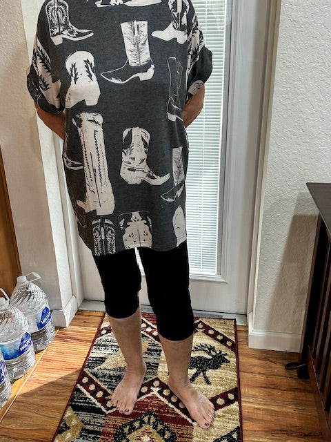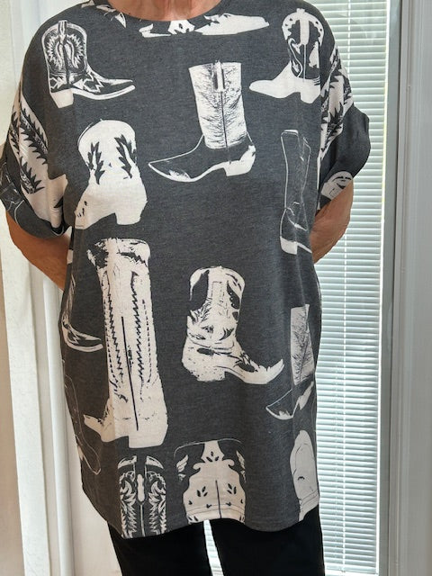 Get ready to scoot and boogie in style with our favorite oversized Scootin Boogie Top! Featuring a roomy fit and cuffed sleeves, this top pairs perfectly with all your favorite boots. So go ahead, give me all the boots and get ready to rock this top with a playful and quirky attitude!